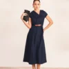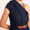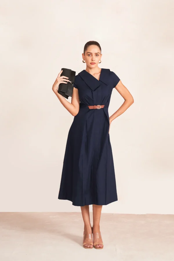 Structured and formal dress, suitable for all things work. Blenda dress features a waist belt detail attached to the dress making it a unique trim detail that amplifies the complete look.