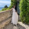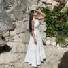 One of our iconic silhouettes, this white and purple trim dress is perfect for a summer event. With a straight neckline, thick straps and flowy cut, its comfort and elegance is guaranteed!