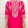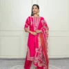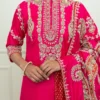 This ensemble from our Naaz Collection is adorned with very fine dabka zardozi embroidery teamed up with a dogri salwar and an Odhni. The kurta will have a zero neck with placket, three-quarter sleeves and short slits. The salwar will have a embroidery border at hem. The odhni will have very fine paisley’s jaal with patching and it will be finished by silk chanderi banarsi fabric in a contrast color.