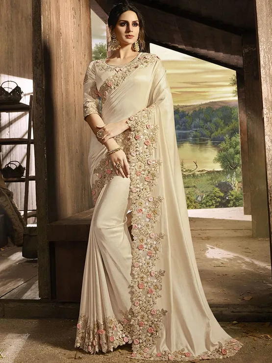 Beige and Brown color Saree in Shimmer fabric with Embroidered, Moti, Sequence, Thread, Zari work